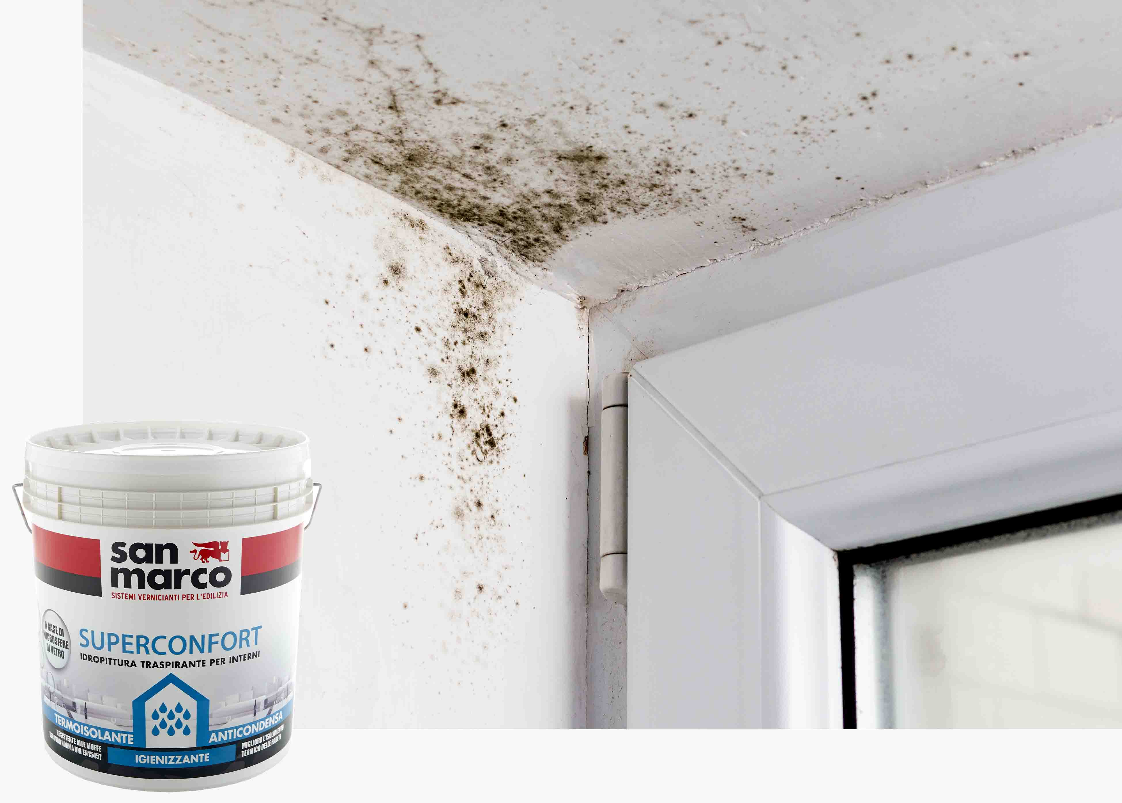 Superconfort è la nostra pittura anticondensa e antimuffa, ideale in ambienti particolarmente umidi e soluzione nel caso in cui l'origine della muffa sia la presenza di condensa sulle pareti. Scopri il ciclo antimuffa completo a questo link.