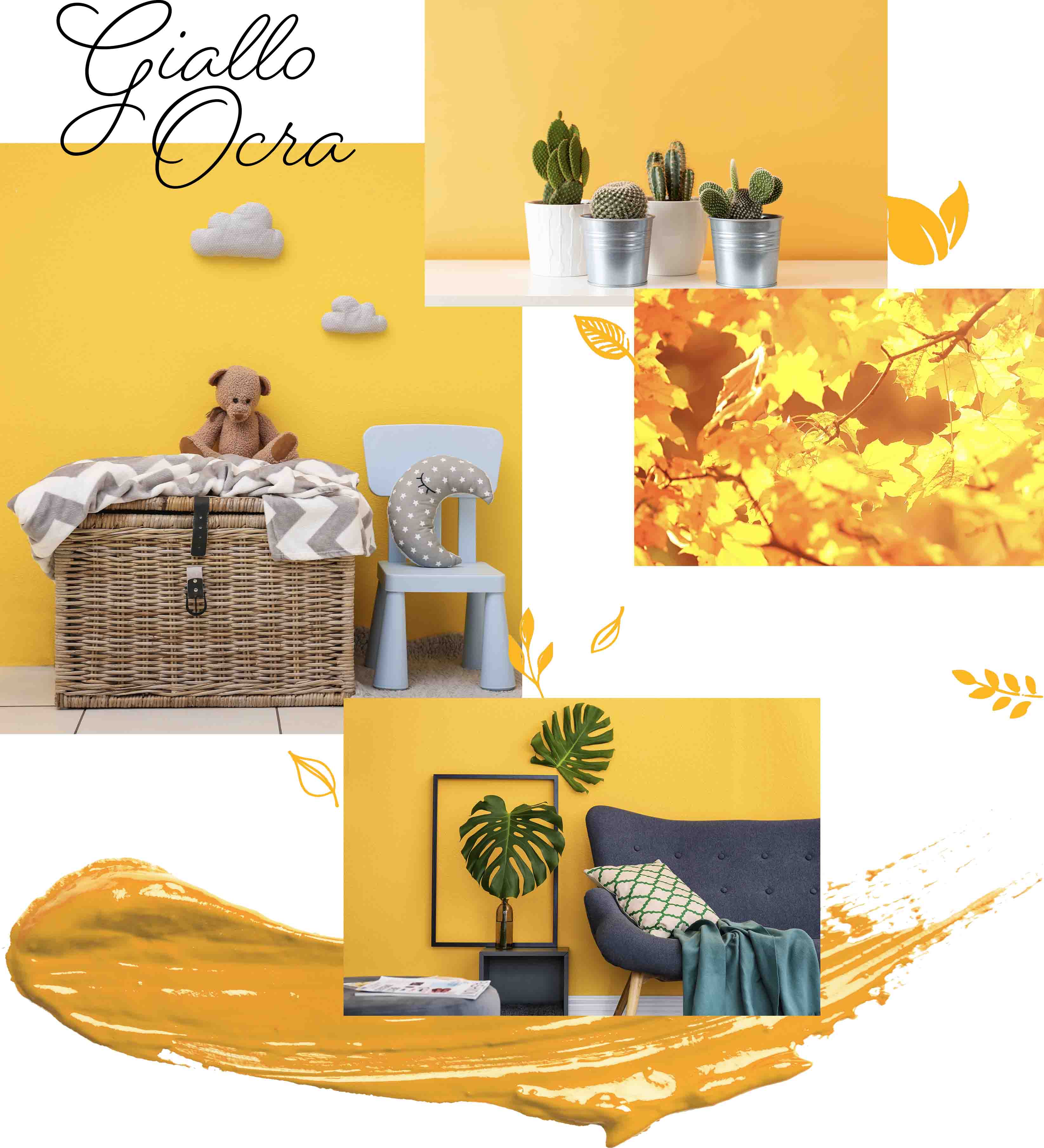 Il giallo ocra è una variante del giallo che tende all'arancione e porta con sé una sfumatura vicina ai colori del sole al tramonto e alla terra. A metà tra giallo e marrone, il color giallo ocra deve il suo nome alla parola greca chros che significa giallo. Richiamo di sensazioni piacevoli di comfort e calore, il giallo ocra è un colore materico e avvolgente che si inserisce come protagonista all'interno di ogni ambiente domestico con la sua luce calda.